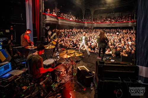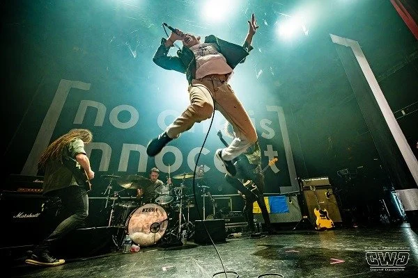 Un groupe de musiciens performe sur scène, avec un chanteur à gauche, un guitariste au centre et un bassiste à gauche, sous un éclairage lumineux. La scène est sombre et dynamique, avec plusieurs spectateurs visibles en premier plan.
